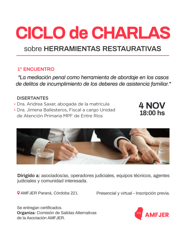 El primer encuentro se titula “La mediación penal como herramienta de abordaje en los casos de delitos de incumplimiento de los deberes de asistencia familiar” y estará a cargo de las Dras. Andrea Saxer, abogada de la matrícula, y Jimena Ballesteros, Fiscal a cargo de la Unidad de Atención Primaria Ministerio Público Fiscal de Entre Ríos. Se llevará a cabo de manera presencial el 4 de noviembre a las 18 hs. en la sede de Paraná de la AMFJER, Córdoba 221, con cupos limitados, y también de manera virtual a través de plataforma Zoom.