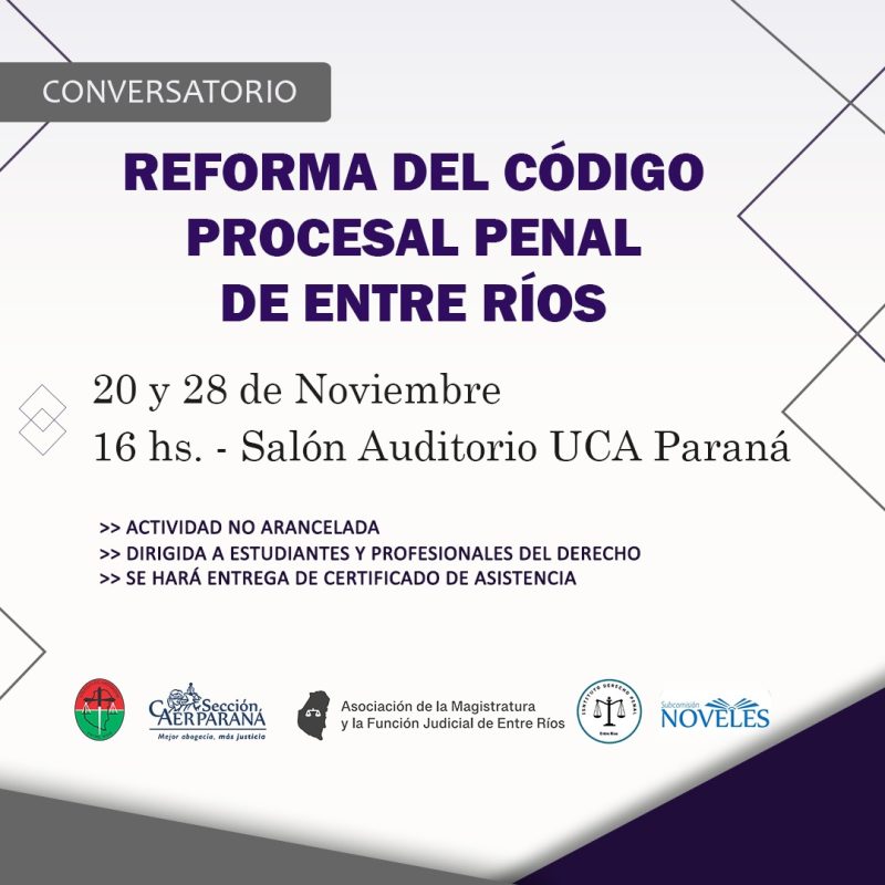 Invitamos a participar del CONVERSATORIO “REFORMA DEL CÓDIGO PROCESAL PENAL DE ENTRE RÍOS” coorganizado por el Colegio de la Abogacía de Entre Ríos, la Asociación de la Magistratura y la Función Judicial de Entre Ríos, Instituto de Derecho Penal, Subcomisión de Noveles Seccional Paraná. El mismo se realizará en 2 fechas, jueves 20 y viernes 28 de noviembre del corriente año, a las 16 hs. en el salón auditorio de la UCA Paraná, y está destinado a estudiantes y profesionales del derecho, e integrantes del Poder Judicial.