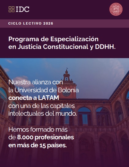 Tenemos el agrado de invitarles a participar en el programa de “Especialización en Justicia Constitucional y Derechos Humanos 2026”, el cual se desarrolla a través del convenio vigente con la Universidad de Bolonia (Italia) y el Instituto para el Desarrollo Constitucional (IDC).
