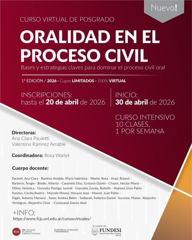 Nos complace invitar a participar en la primera edición del Curso Virtual de Posgrado: Oralidad en el Proceso Civil, organizado por la Facultad de Ciencias Jurídicas y Sociales (FCJS) de la UNL en convenio con FUNDESI.