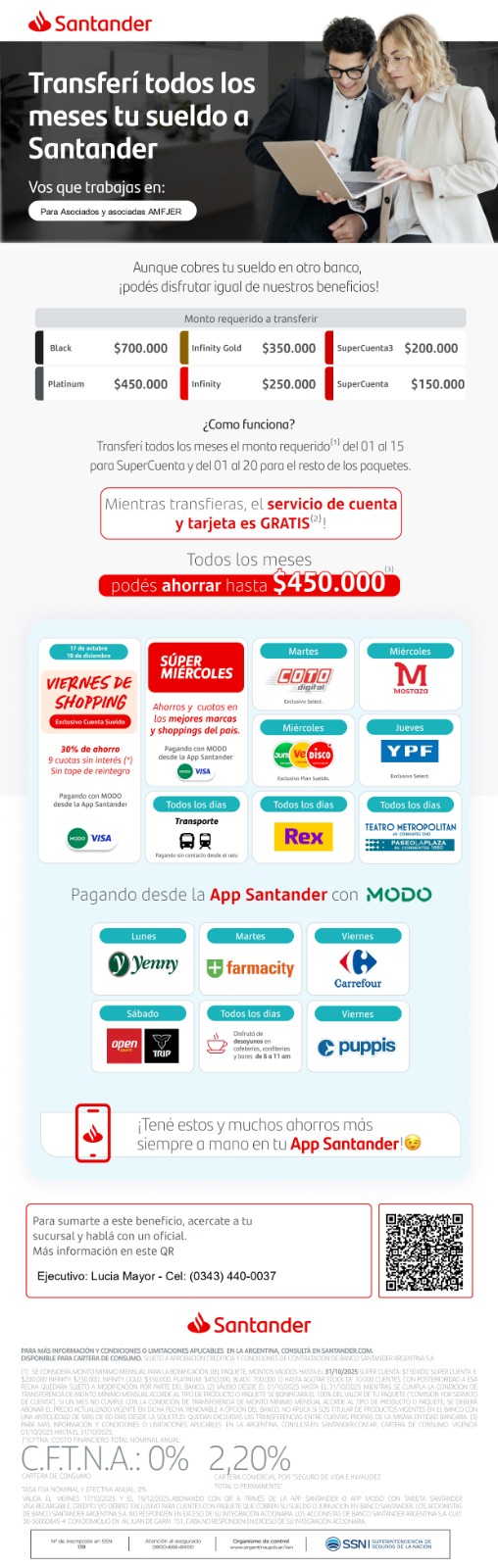 Se adjuntan dos archivos: uno con las condiciones y beneficios generales de las cuentas junto con los contactos de los gerentes de cada sucursal (Santander 1), y otro con los diferentes productos que ofrece el banco (Santander 2).